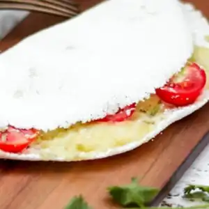 Tapioca recheada com tomate, queijo muçarela, azeitona e orégano, uma mistura de sabores que se complementam perfeitamente, proporcionando uma explosão de sabor mediterrâneo em cada mordida.